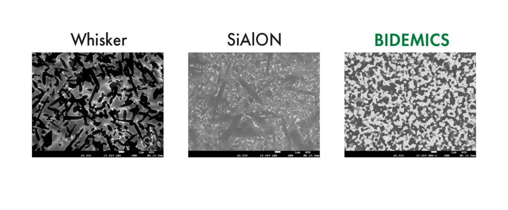 This combination makes BIDEMICS both more wear-resistant and more heat-stable than conventional ceramic grades, explaining why it can run at cutting speeds up to 500 m/min where whiskers typically fail.