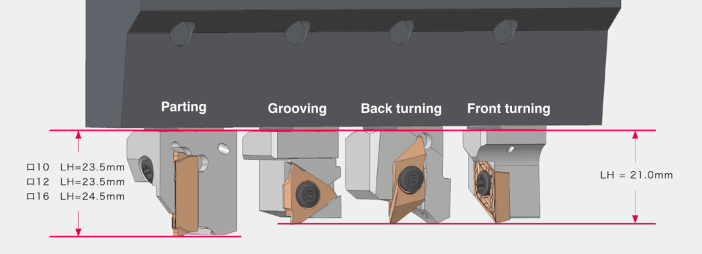 • Alle modularen Köpfe sind standardisiert und haben die gleiche Schneidenposition, um Konsistenz zu gewährleisten. (Die Schaftabmessungen und -spezifikationen können bei Abstechern und anderen Spezialwerkzeugen abweichen).