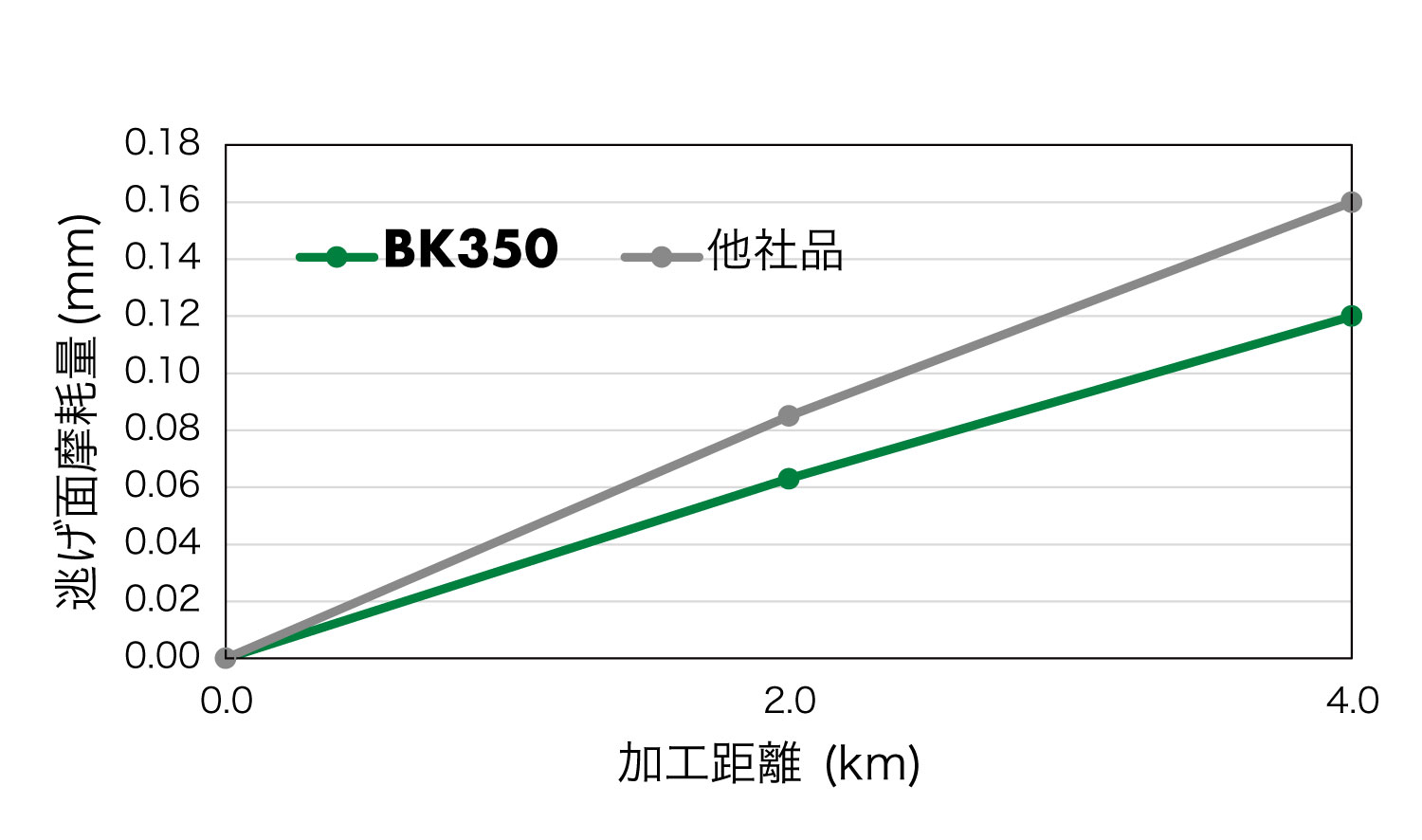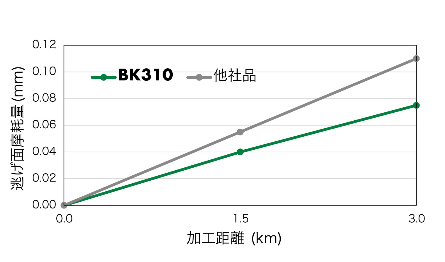 従来CBNは隅R部にビビりが発生し寿命に至っていたが、BK310は切れ味を維持し1.5倍の寿命を達成した。