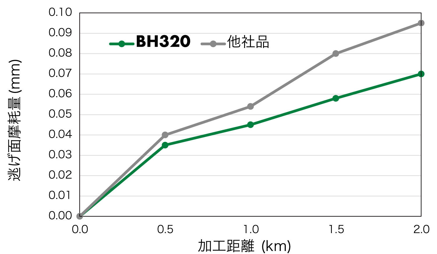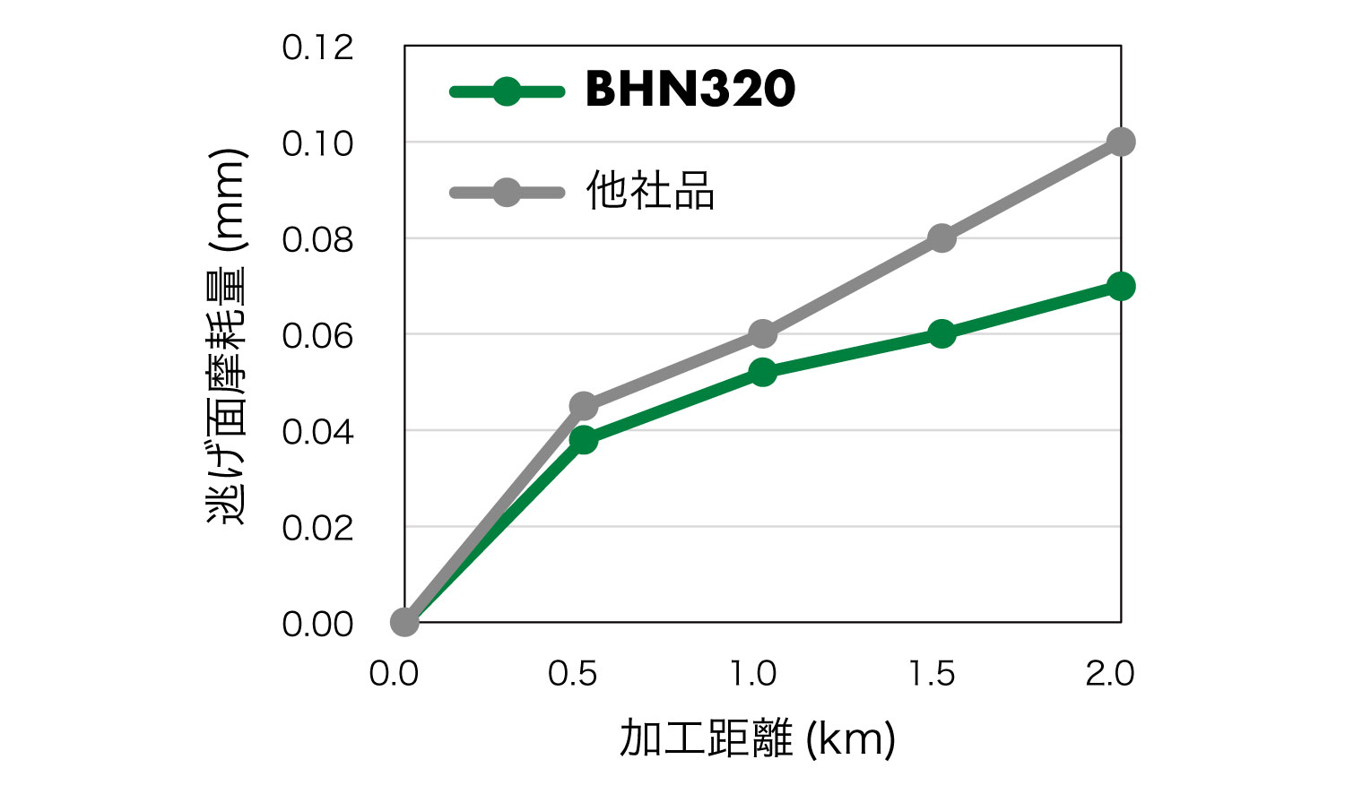 他社CBNは加工面粗さ悪化により寿命に至っていたが、BHN320は境界摩耗が抑制され2倍の寿命を達成した。